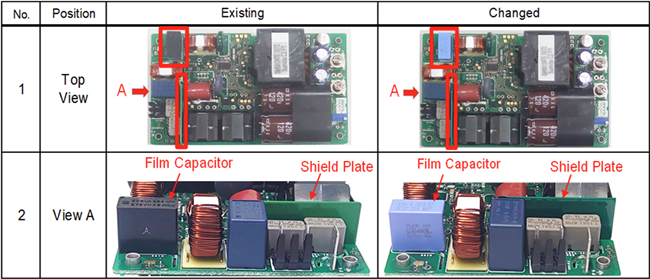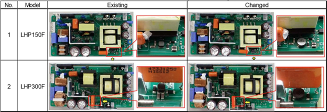 Bei den Serien LHP150F und LHP300F wird eine Bauteiländerung vorgenommen, um die Komponentenverfügbarkeit und Qualität zu verbessern. Betroffen ist die Drosselspule L401.